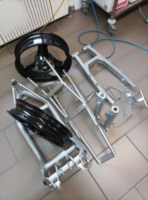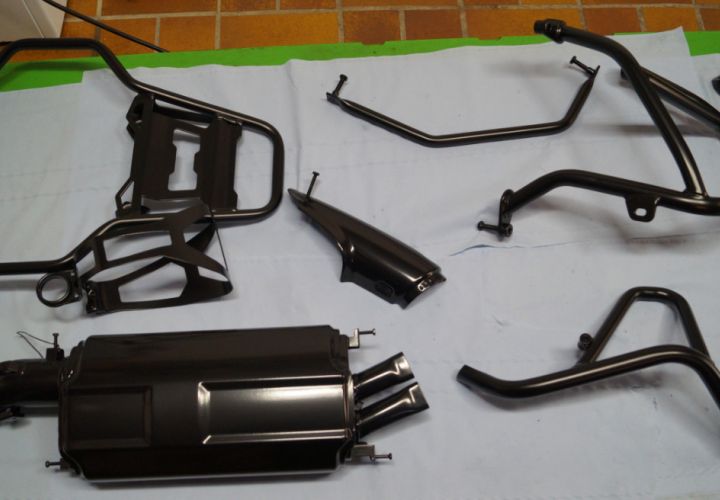 Motorcykelramar och andra påbyggnadsdelar (t.ex. svingar, styren eller fotstöd) pulverlackeras fotstöd) pulverlackeras med en högkvalitativ 3-skiktsprocess. pulverlackerad. Motorcykeldelarna avlackas i förväg, Materialet förbehandlas varsamt genom glaspärlblästring. Därefter följer en högkvalitativ pulverlackering i alla specialfärger eller RAL-färger.