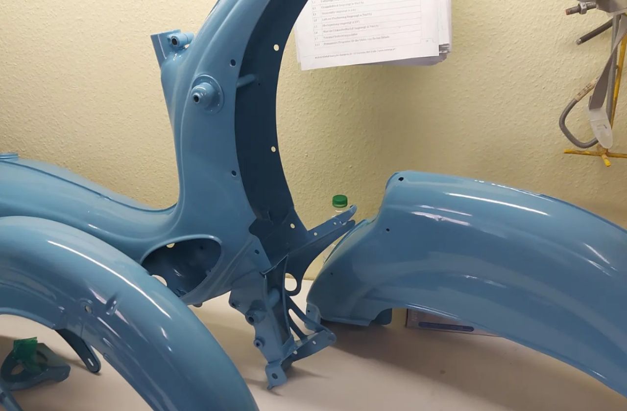 Motorcykelramar och andra påbyggnadsdelar (t.ex. svingar, styren eller fotstöd) pulverlackeras fotstöd) pulverlackeras med en högkvalitativ 3-skiktsprocess. pulverlackerad. Motorcykeldelarna avlackas i förväg, Materialet förbehandlas varsamt genom glaspärlblästring. Därefter följer en högkvalitativ pulverlackering i alla specialfärger eller RAL-färger.